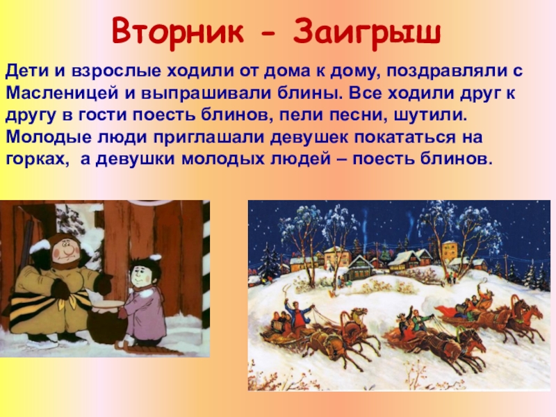 с Масленицей и выпрашивали блины. Все ходили друг к другу в гости поесть блинов, пели песни, шутили. Молодые люди приглашали девушек покататься на горках, а девушки молодых людей – поесть блинов.
