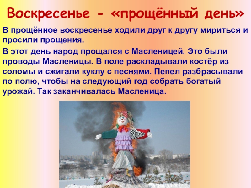В этот день народ прощался с Масленицей. Это были проводы Масленицы. В поле раскладывали костёр из соломы и сжигали куклу с песнями. Пепел разбрасывали по полю, чтобы на следующий год собрать богатый урожай. Так заканчивалась Масленица.