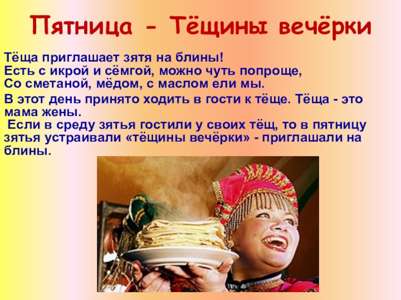 Если в среду зятья гостили у своих тёщ, то в пятницу зятья устраивали «тёщины вечёрки» - приглашали на блины.