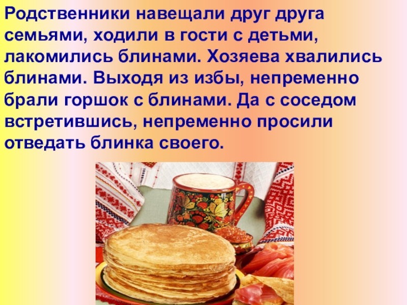 блинами. Хозяева хвалились блинами. Выходя из избы, непременно брали горшок с блинами. Да с соседом встретившись, непременно просили отведать блинка своего.