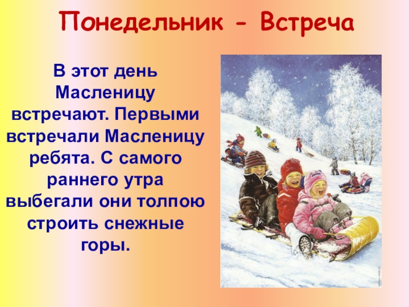 Слайд 8Каждый день Масленицы имел своё название и свои забавы.
