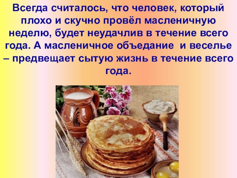 Слайд 6Всегда считалось, что человек, который плохо и скучно провёл масленичную неделю, будет неудачлив