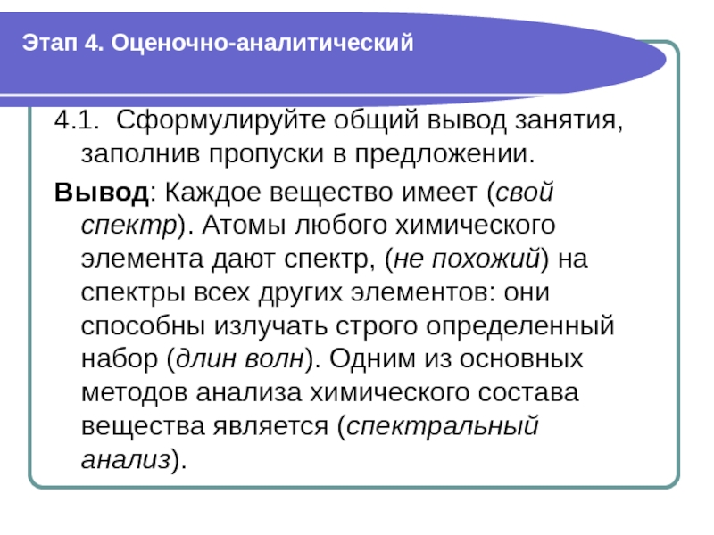 Каждое вещество имеет (свой спектр). Атомы любого химического элемента дают спектр, (не похожий) на спектры всех других элементов: они способны излучать строго определенный набор (длин волн). Одним из основных методов анализа химического состава вещества является (спектральный анализ).