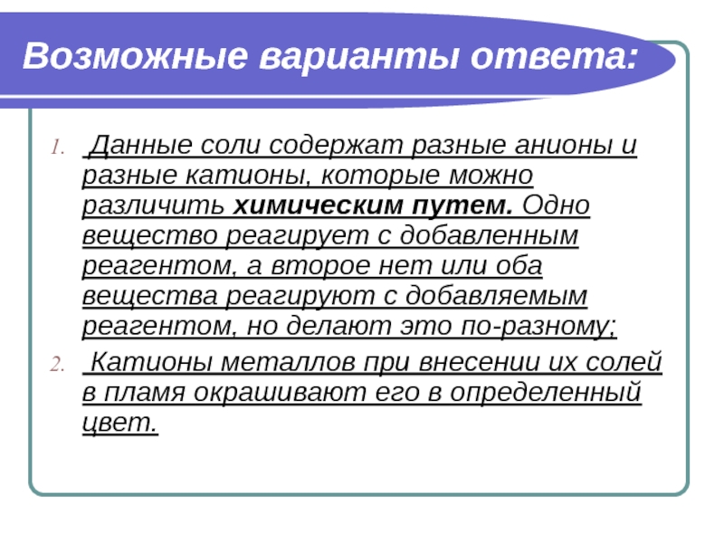 катионы, которые можно различить химическим путем. Одно вещество реагирует с добавленным реагентом, а второе нет или оба вещества реагируют с добавляемым реагентом, но делают это по-разному;