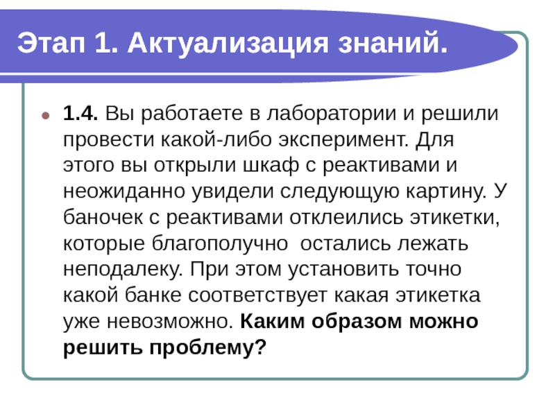 какой-либо эксперимент. Для этого вы открыли шкаф с реактивами и неожиданно увидели следующую картину. У баночек с реактивами отклеились этикетки, которые благополучно остались лежать неподалеку. При этом установить точно какой банке соответствует какая этикетка уже невозможно. Каким образом можно решить проблему?