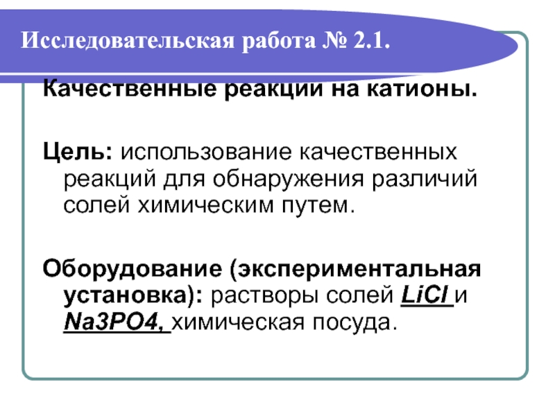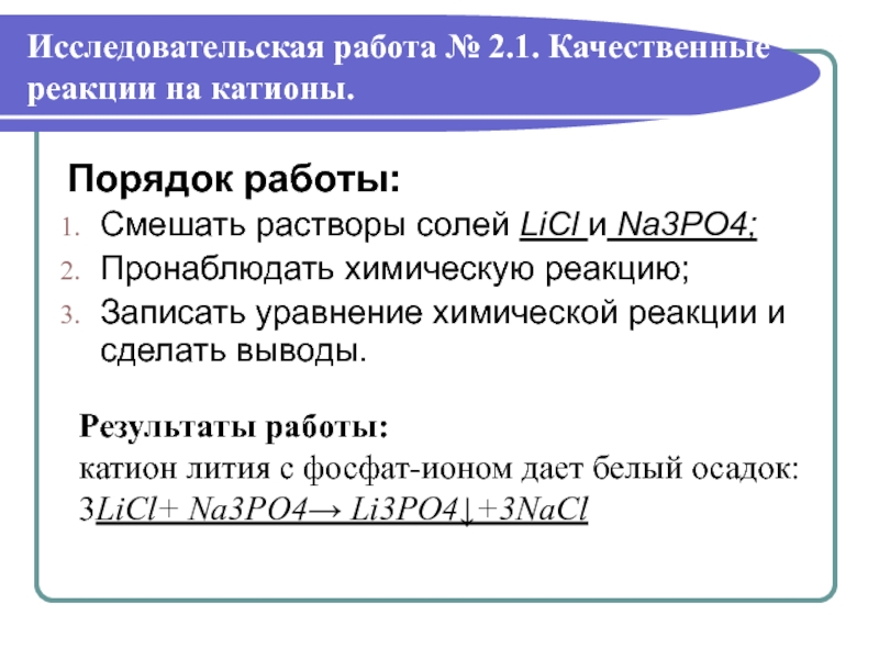 Слайд 13Исследовательская работа № 2.1. Качественные реакции на катионы.