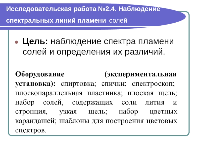 Слайд 19Исследовательская работа №2.4. Наблюдение спектральных линий пламени солей