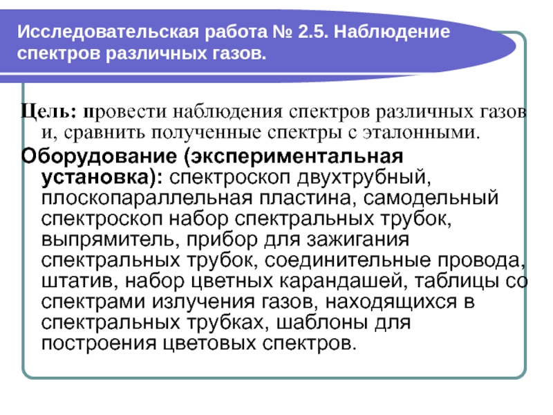 Слайд 21Исследовательская работа № 2.5. Наблюдение спектров различных газов.