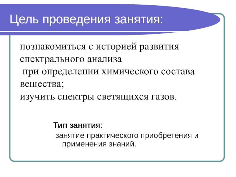 Оборудование (экспериментальная установка): спиртовка; спички; спектроскоп; плоскопараллельная пластинка; плоская щель; набор солей, содержащих соли лития и стронция, узкая щель; набор цветных карандашей; шаблоны для построения цветовых спектров.