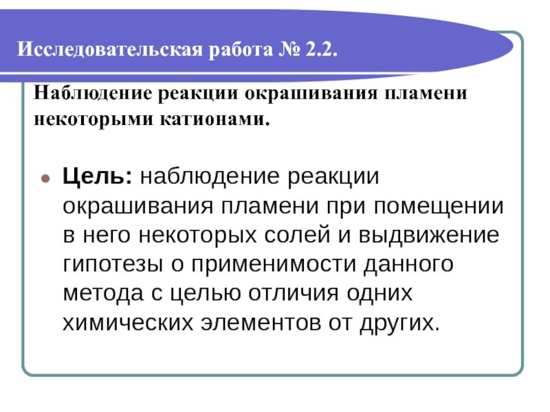 Слайд 16Исследовательская работа №2.3. Наблюдение реакции окрашивания пламени некоторыми катионами с использованием