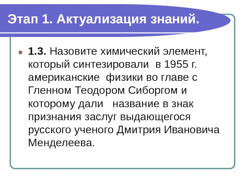 1.3. Назовите химический элемент, который синтезировали в 1955