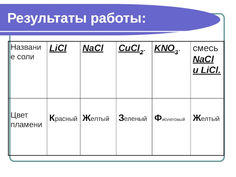 Катионы металлов при внесении их солей в пламя окрашивают его в определенный цвет.