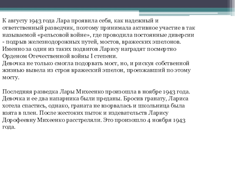 Слайд 5К августу 1943 года Лара проявила себя, как надежный и ответственный