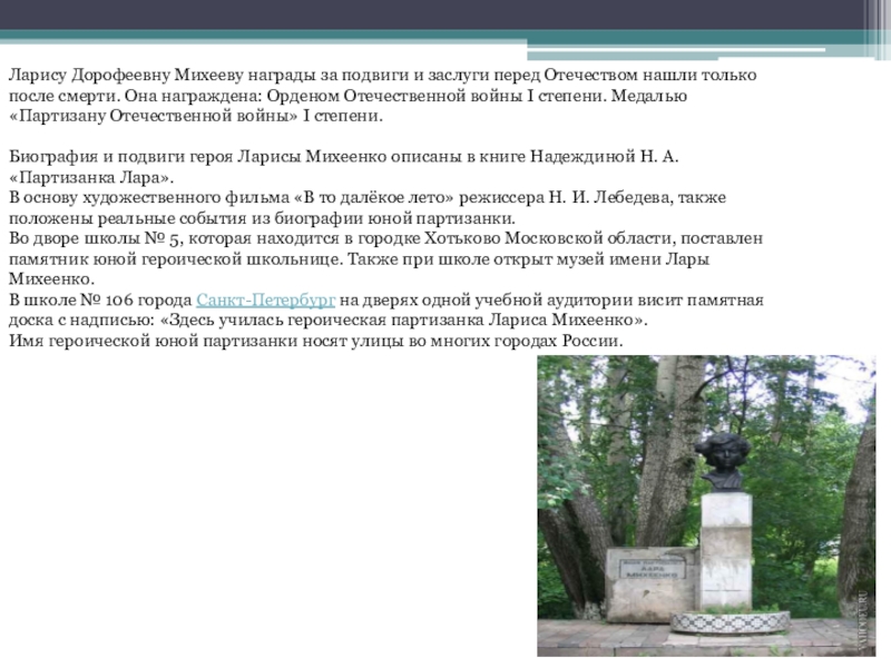 Биография и подвиги героя Ларисы Михеенко описаны в книге Надеждиной Н. А. «Партизанка Лара».