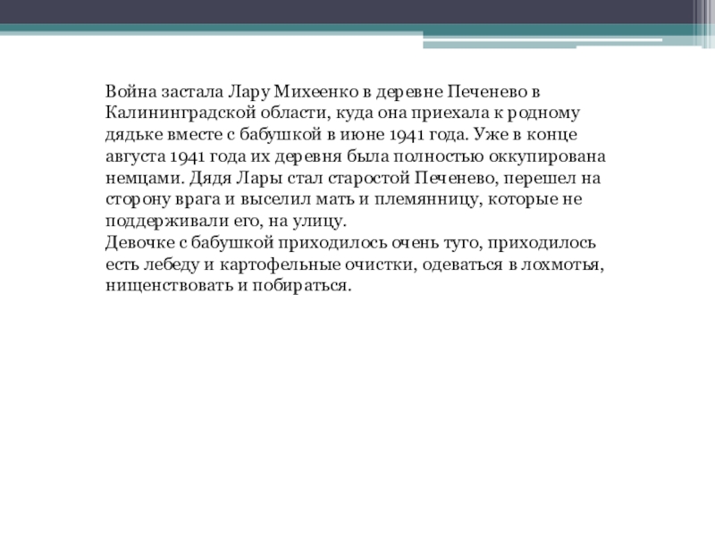 Слайд 3Война застала Лару Михеенко в деревне Печенево в Калининградской области, куда