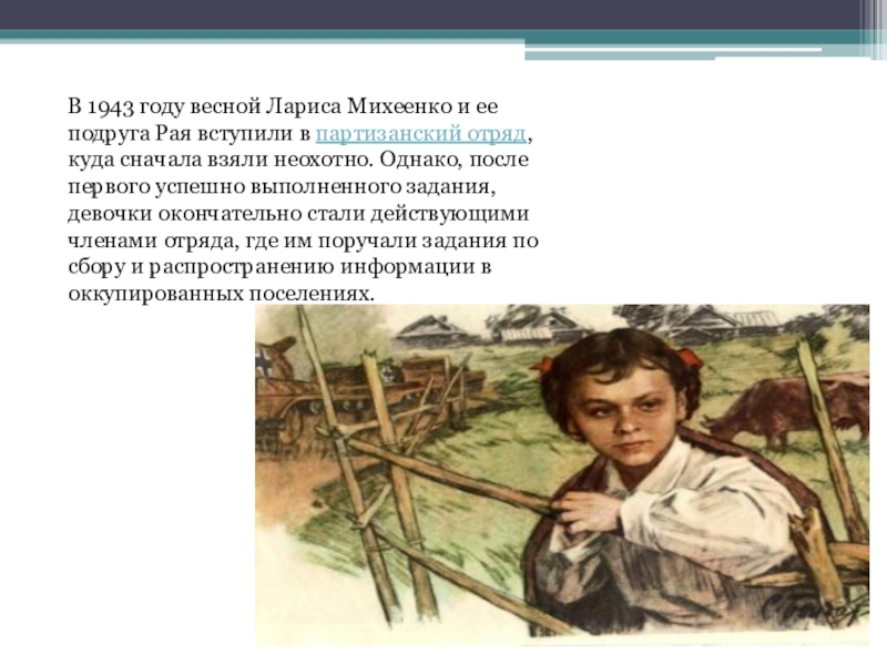 В 1943 году весной Лариса Михеенко и ее подруга Рая вступили в партизанский отряд, куда сначала взяли неохотно.