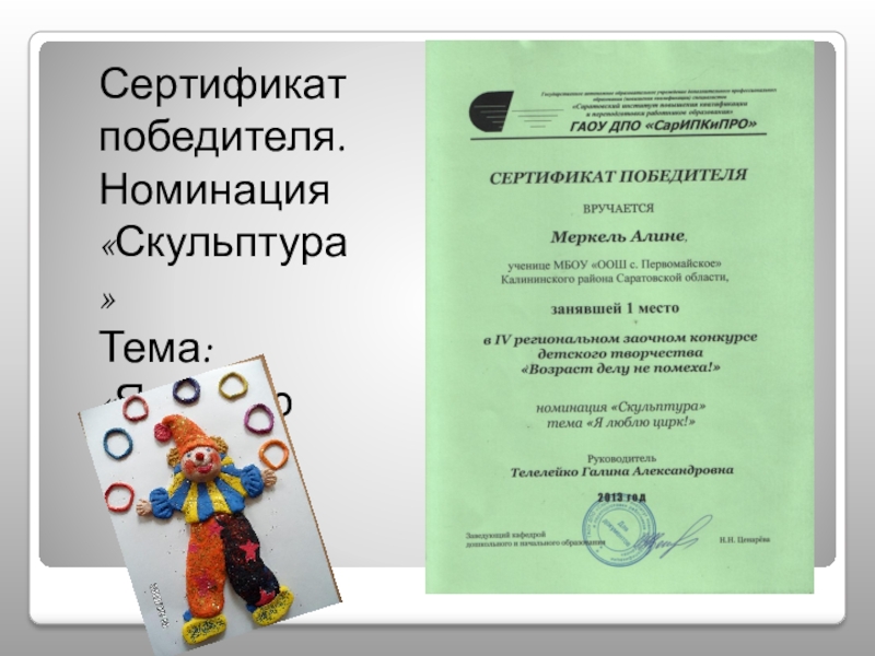 Слайд 4Сертификат победителя. Номинация «Скульптура» Тема: «Я люблю цирк»