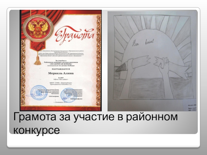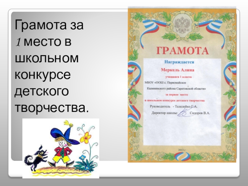 Слайд 6Грамота за 1 место в школьном конкурсе детского творчества.