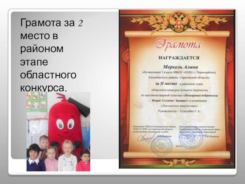 Слайд 7Грамота за 2 место в районом этапе областного конкурса.