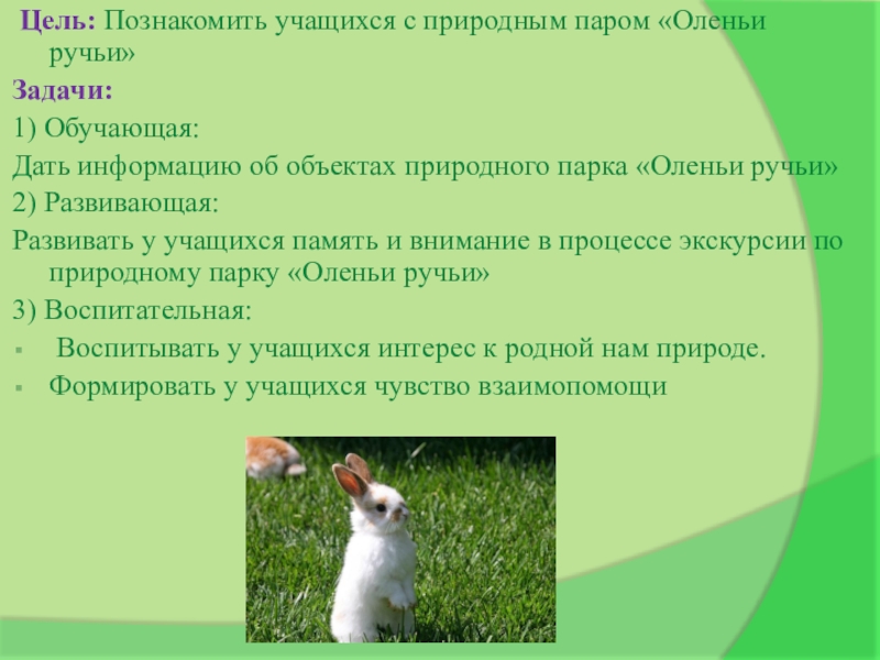 Цель: Познакомить учащихся с природным паром «Оленьи ручьи»Задачи:1) Обучающая:Дать информацию об объектах природного парка «Оленьи ручьи»2) Развивающая:Развивать у учащихся память и внимание в процессе экскурсии по природному парку «Оленьи ручьи»3) Воспитательная: Воспитывать у учащихся интерес