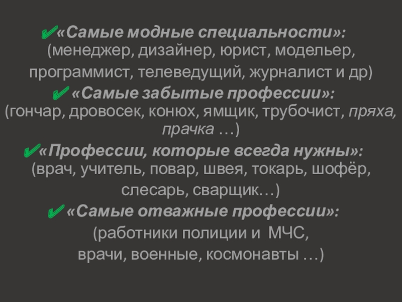 (гончар, дровосек, конюх, ямщик, трубочист, пряха, прачка …)