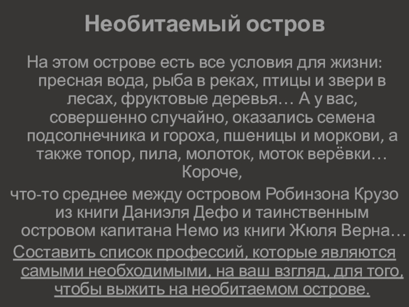 Составить список профессий, которые являются самыми необходимыми, на ваш взгляд, для того, чтобы выжить на необитаемом острове.