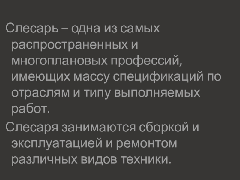 Слесаря занимаются сборкой и эксплуатацией и ремонтом различных видов техники.