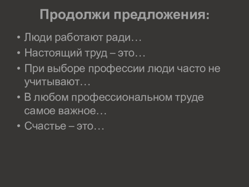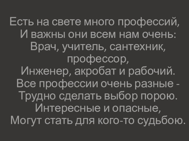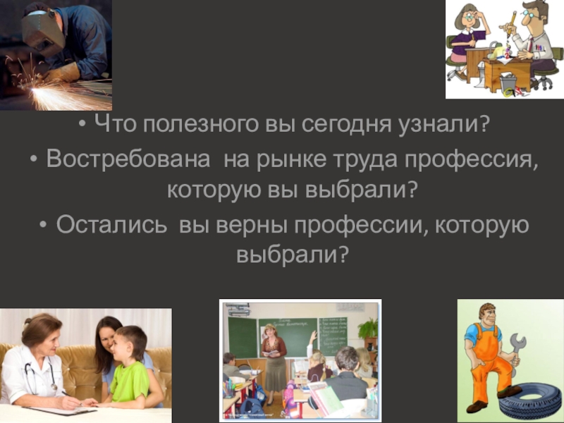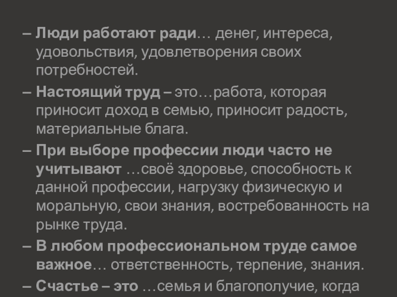 При выборе профессии люди часто не учитывают …своё здоровье, способность к данной профессии, нагрузку физическую и моральную, свои знания, востребованность на рынке труда.