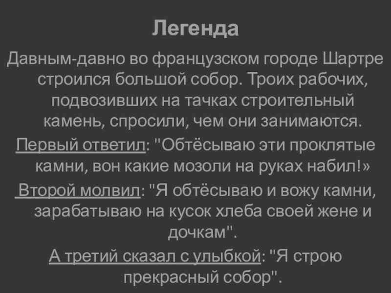 А третий сказал с улыбкой: "Я строю прекрасный собор".
