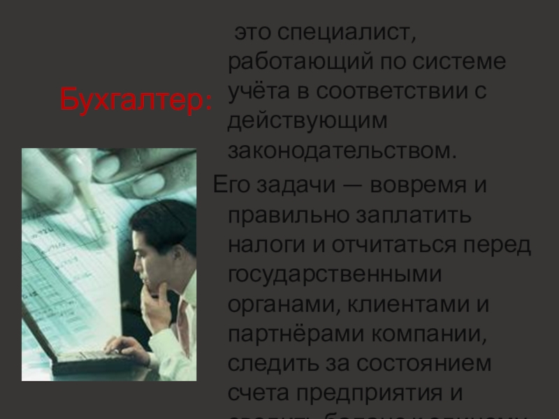 Его задачи — вовремя и правильно заплатить налоги и отчитаться перед государственными органами, клиентами и партнёрами компании, следить за состоянием счета предприятия и сводить баланс к единому показателю.