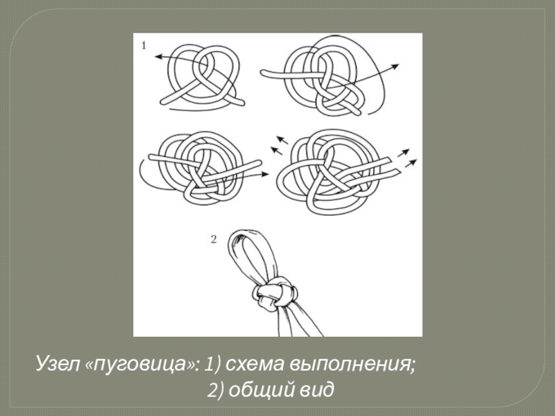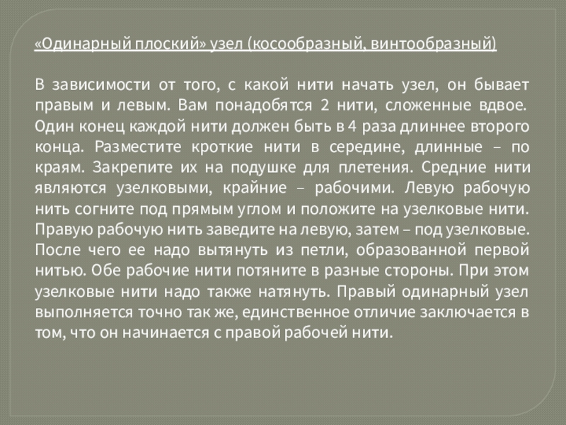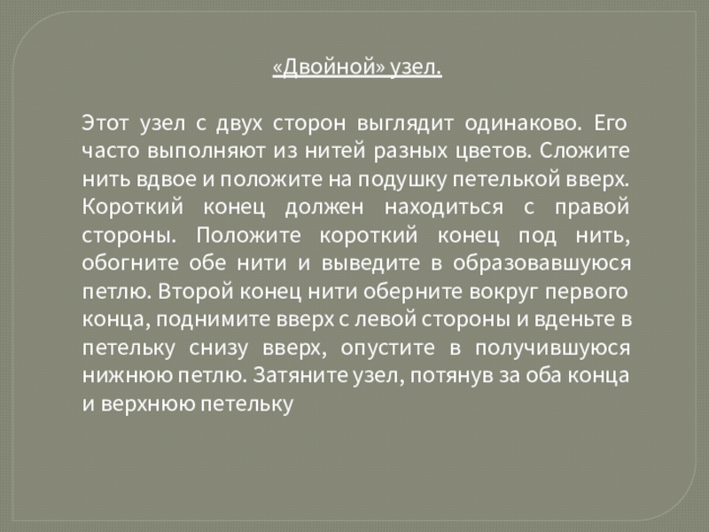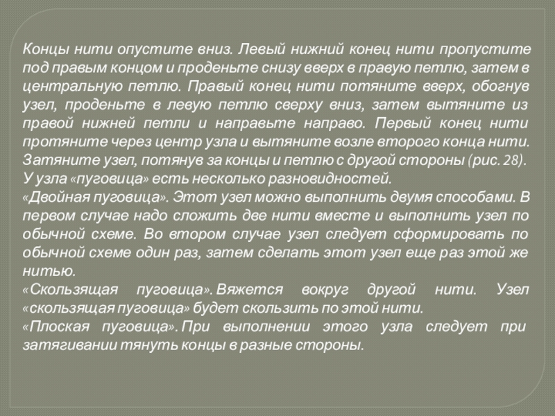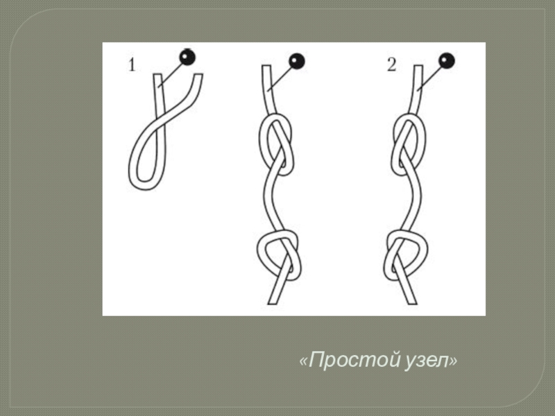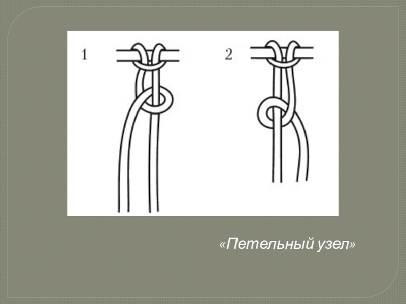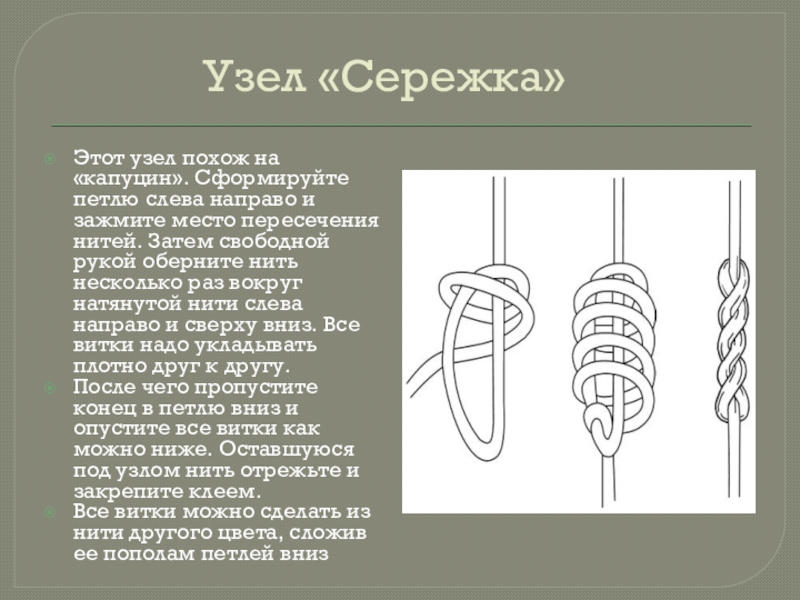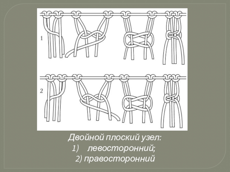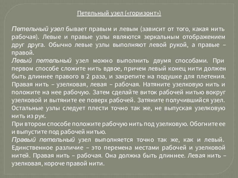 правым и левым. Для его выполнения нужно сложить нить так, чтобы один конец был длиннее другого в 8 раз, при этом короткая нить будет узелковой. Натяните узелковую нить и выполните рабочей нитью петельный узел. Затем расположите рабочую нить под узелковой и выполните левый петельный узел вторым способом. Рабочей нитью обогните снизу вверх узелковую и вытяните ее из-под рабочей.