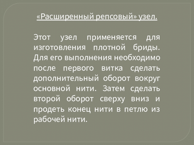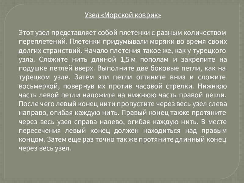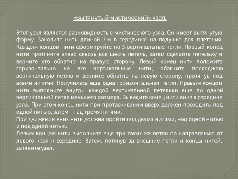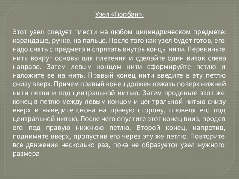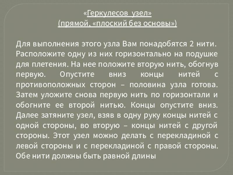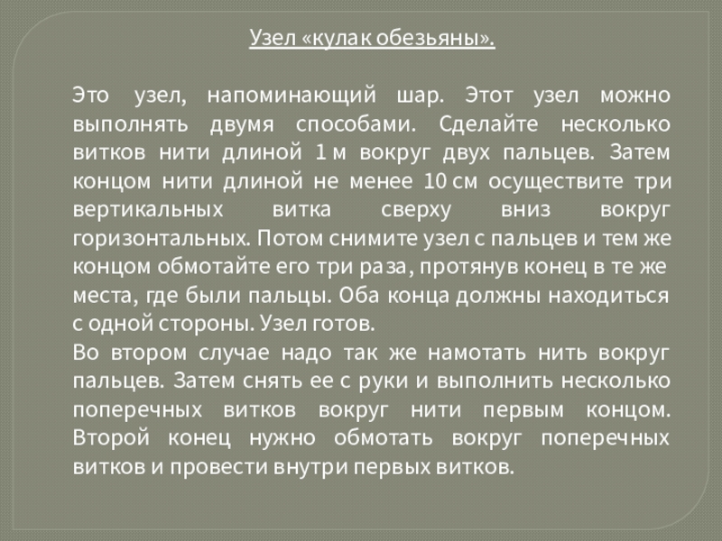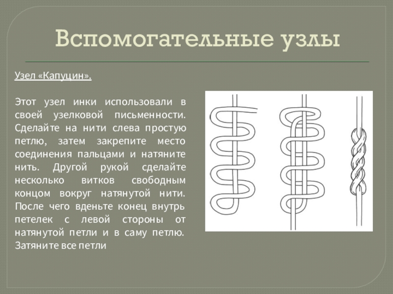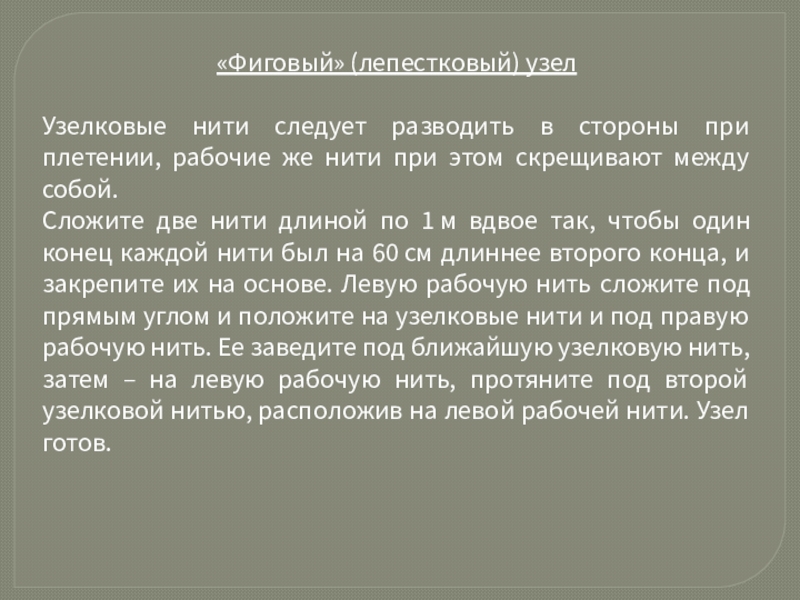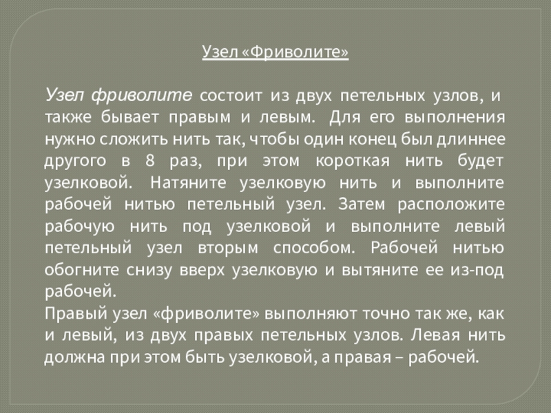 правым и левым. Для его выполнения нужно сложить нить так, чтобы один конец был длиннее другого в 8 раз, при этом короткая нить будет узелковой. Натяните узелковую нить и выполните рабочей нитью петельный узел. Затем расположите рабочую нить под узелковой и выполните левый петельный узел вторым способом. Рабочей нитью обогните снизу вверх узелковую и вытяните ее из-под рабочей.