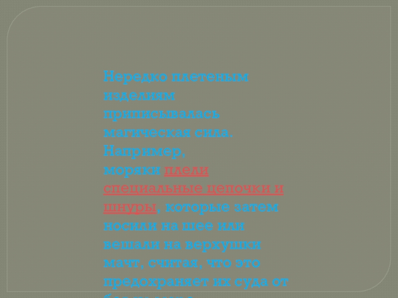 Слайд 5Нередко плетеным изделиям приписывалась магическая сила. Например, моряки плели специальные цепочки и
