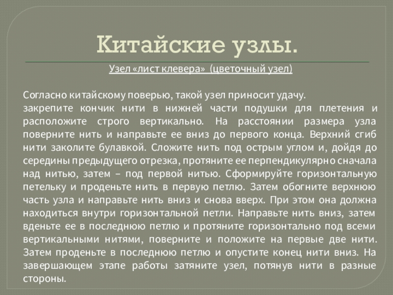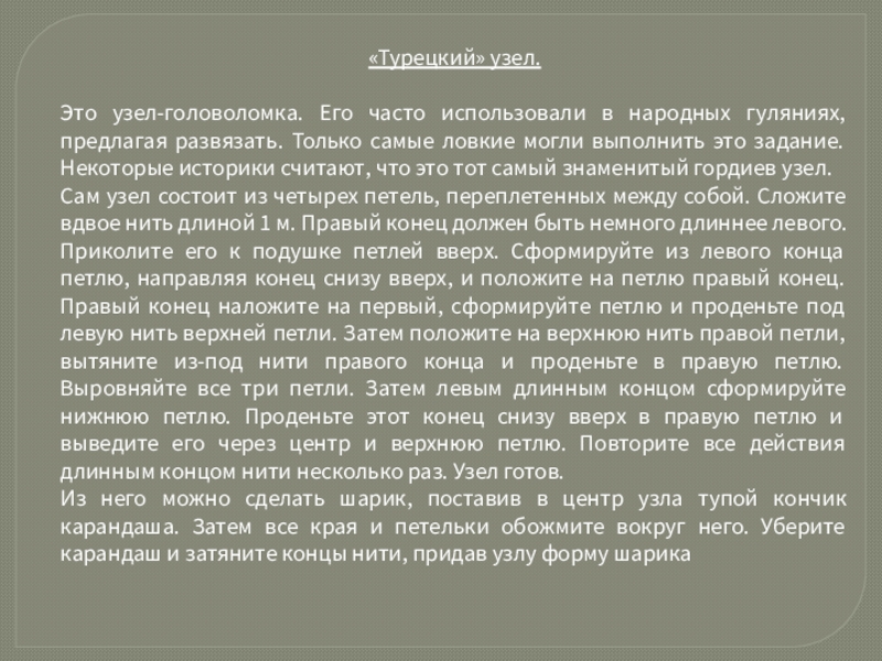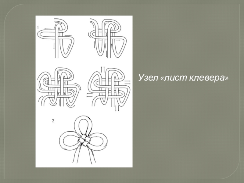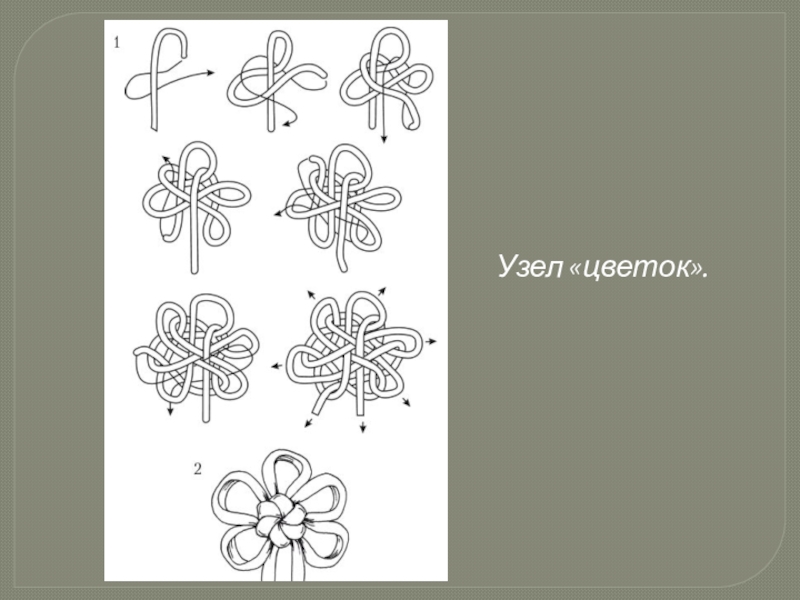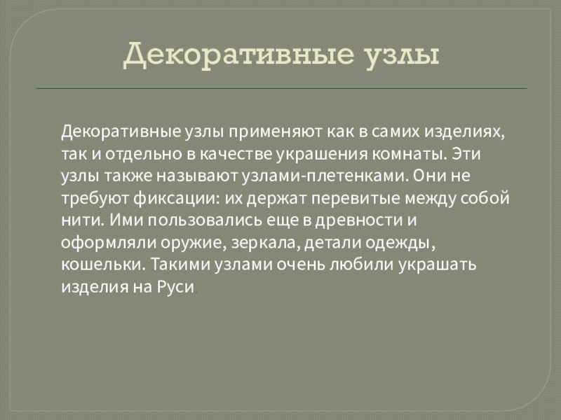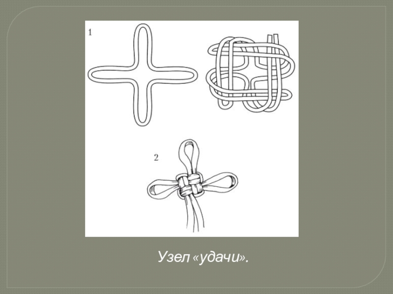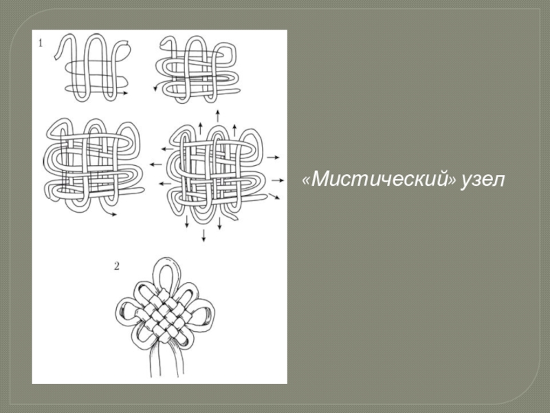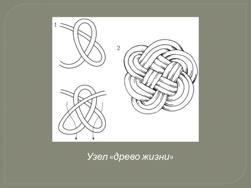 в качестве украшения комнаты. Эти узлы также называют узлами-плетенками. Они не требуют фиксации: их держат перевитые между собой нити. Ими пользовались еще в древности и оформляли оружие, зеркала, детали одежды, кошельки. Такими узлами очень любили украшать изделия на Руси.