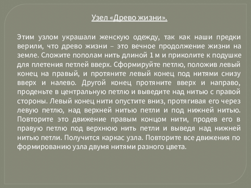 верили, что древо жизни – это вечное продолжение жизни на земле. Сложите пополам нить длиной 1 м и приколите к подушке для плетения петлей вверх. Сформируйте петлю, положив левый конец на правый, и протяните левый конец под нитями снизу вверх и налево. Другой конец протяните вверх и направо, проденьте в центральную петлю и выведите над нитью с правой стороны. Левый конец нити опустите вниз, протягивая его через левую петлю, над верхней нитью петли и под нижней нитью. Повторите это движение правым концом нити, продев его в правую петлю под верхнюю нить петли и выведя над нижней нитью петли. Получится каркас узла. Повторите все движения по формированию узла двумя нитями разного цвета.