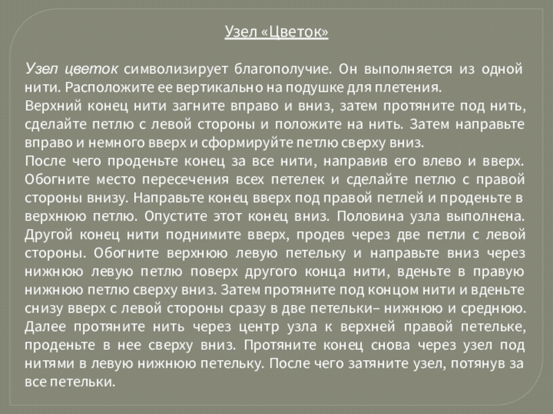Узел цветок символизирует благополучие. Он выполняется из одной нити. Расположите