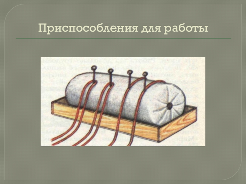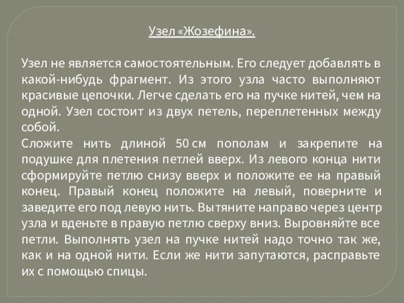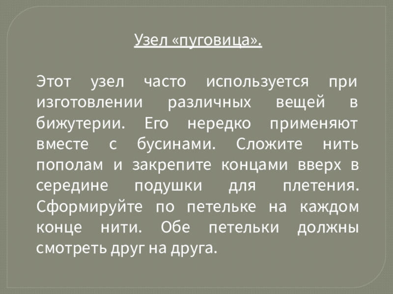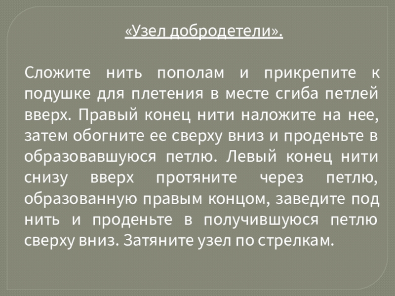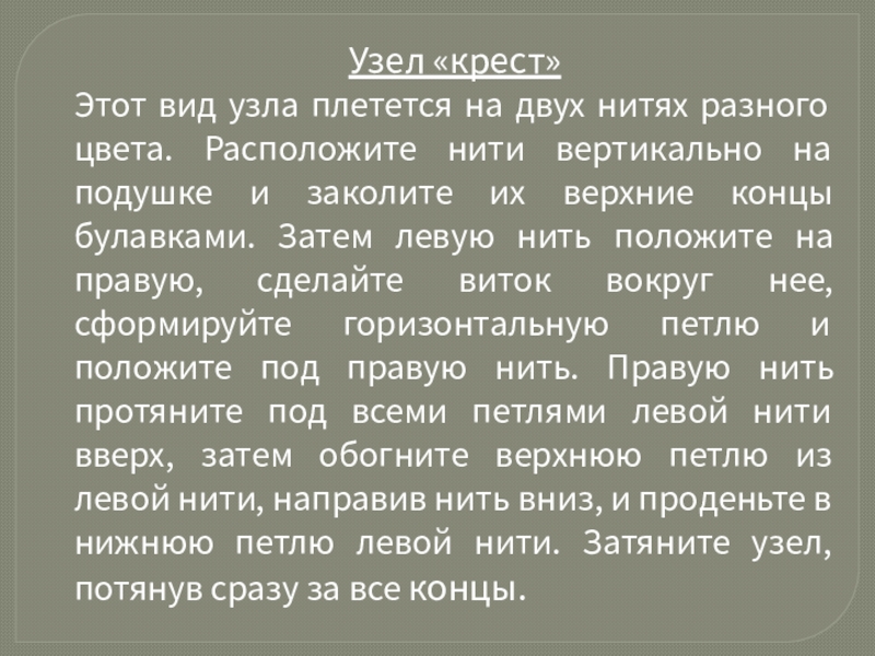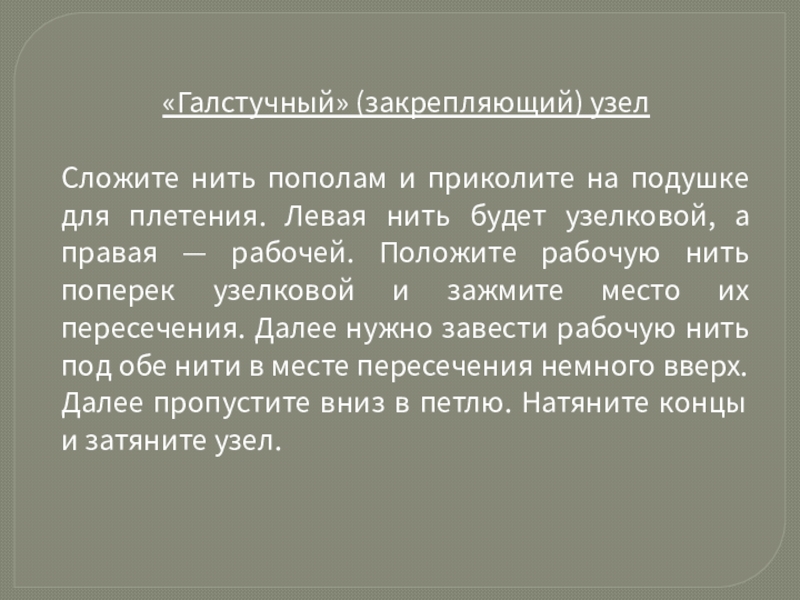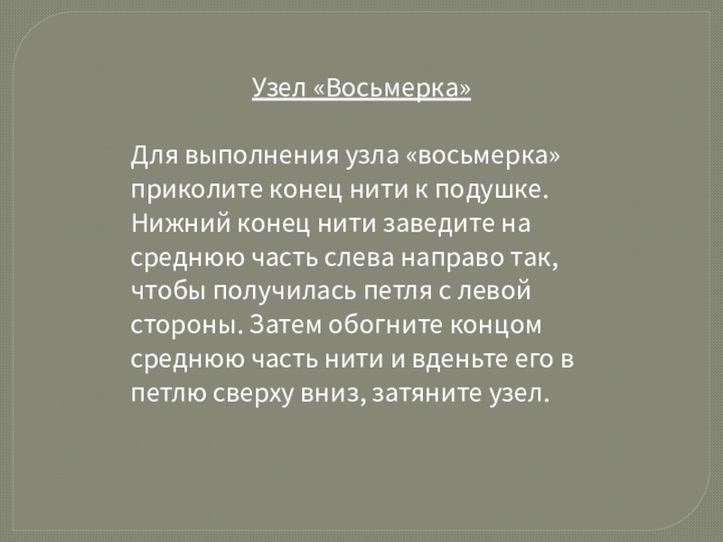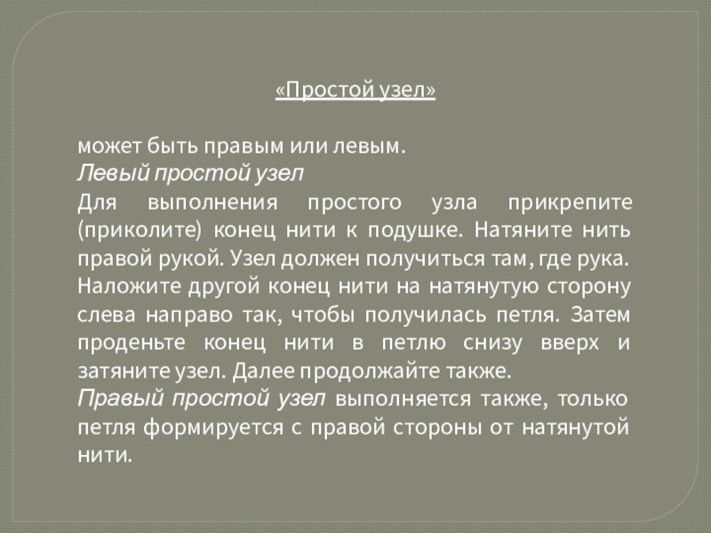 узла прикрепите (приколите) конец нити к подушке. Натяните нить правой рукой. Узел должен получиться там, где рука. Наложите другой конец нити на натянутую сторону слева направо так, чтобы получилась петля. Затем проденьте конец нити в петлю снизу вверх и затяните узел. Далее продолжайте также.