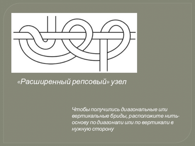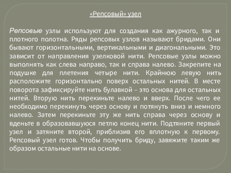 полотна. Ряды репсовых узлов называют бридами. Они бывают горизонтальными, вертикальными и диагональными. Это зависит от направления узелковой нити. Репсовые узлы можно выполнять как слева направо, так и справа налево. Закрепите на подушке для плетения четыре нити. Крайнюю левую нить расположите горизонтально поверх остальных нитей. В месте поворота зафиксируйте нить булавкой – это основа для остальных нитей. Вторую нить перекиньте налево и вверх. После чего ее необходимо перекинуть через основу и потянуть вниз и немного налево. Затем перекиньте эту же нить справа через основу и вденьте в образовавшуюся петлю конец нити. Подтяните первый узел и затяните второй, приблизив его вплотную к первому. Репсовый узел готов. Чтобы получить бриду, завяжите таким же образом остальные нити на основе.