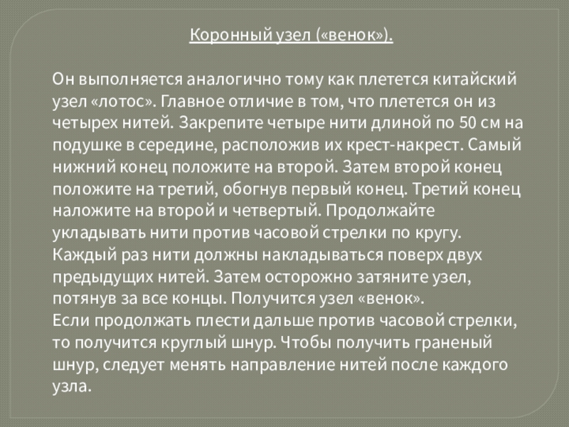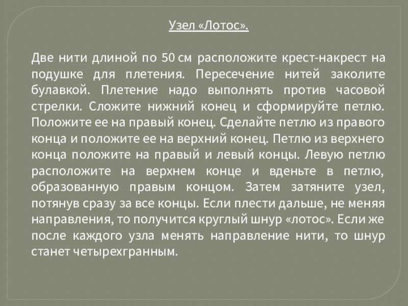 плетения. Пересечение нитей заколите булавкой. Плетение надо выполнять против часовой стрелки. Сложите нижний конец и сформируйте петлю. Положите ее на правый конец. Сделайте петлю из правого конца и положите ее на верхний конец. Петлю из верхнего конца положите на правый и левый концы. Левую петлю расположите на верхнем конце и вденьте в петлю, образованную правым концом. Затем затяните узел, потянув сразу за все концы. Если плести дальше, не меняя направления, то получится круглый шнур «лотос». Если же после каждого узла менять направление нити, то шнур станет четырехгранным.