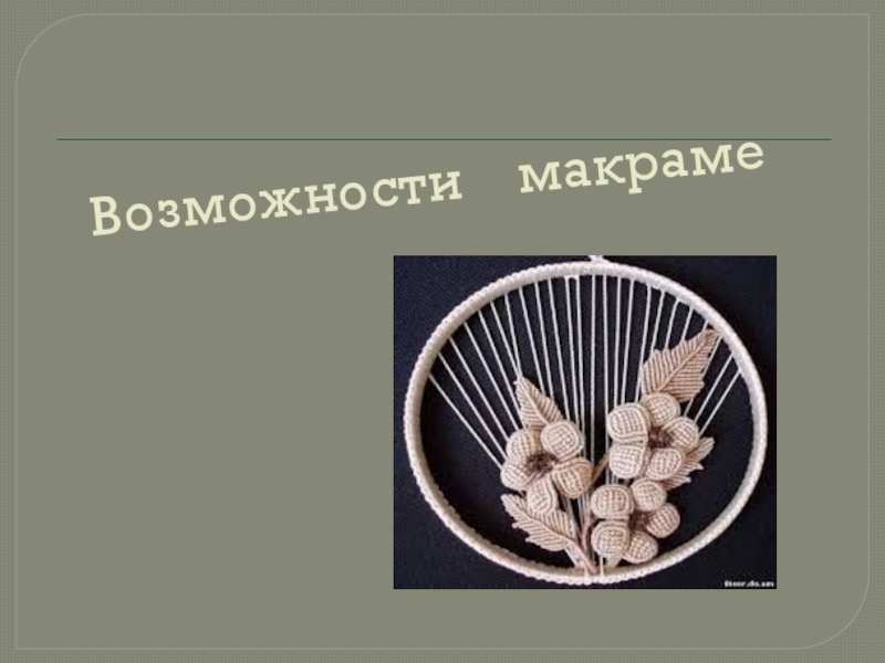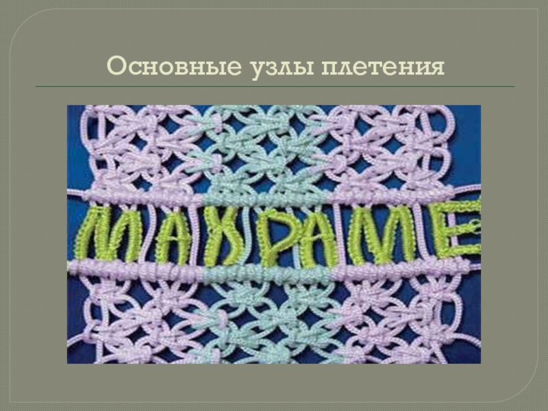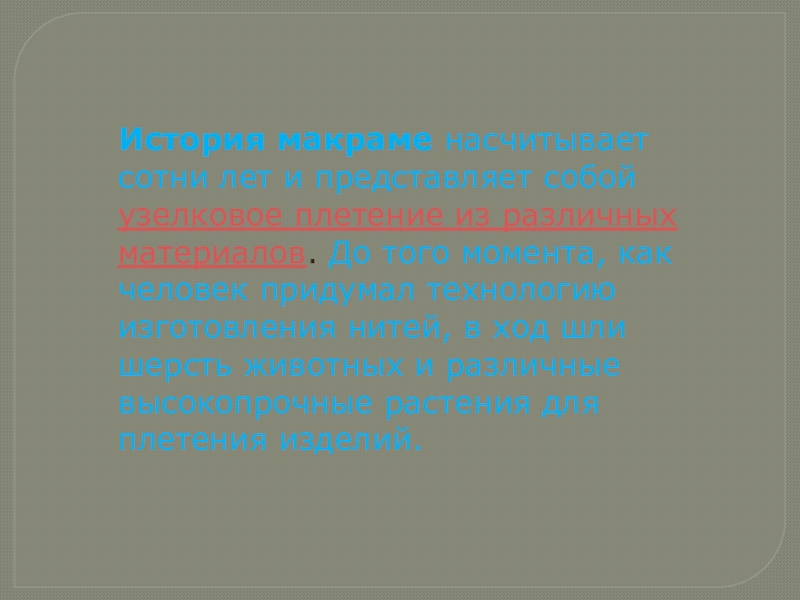 Слайд 2История макраме насчитывает сотни лет и представляет собой узелковое плетение из различных