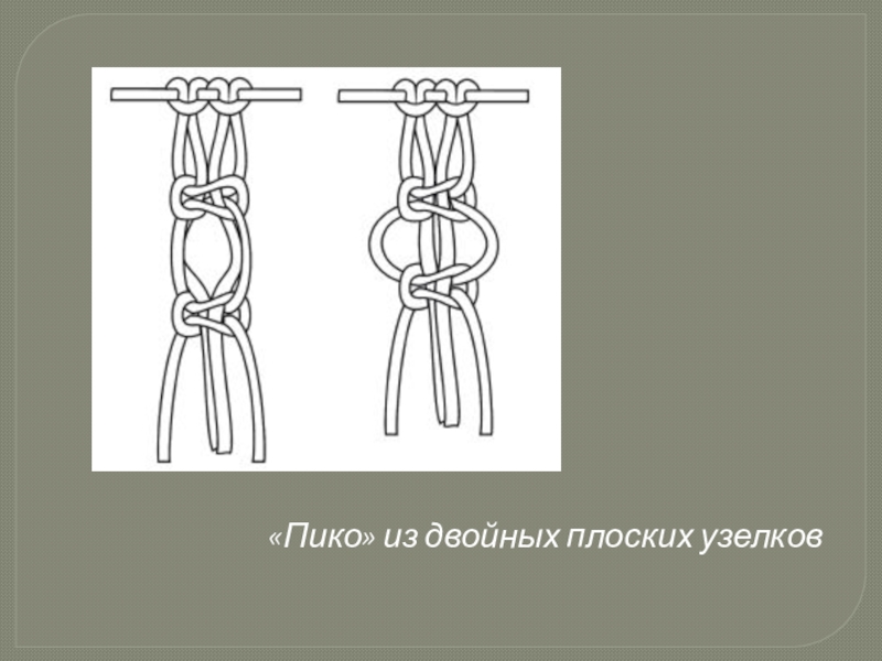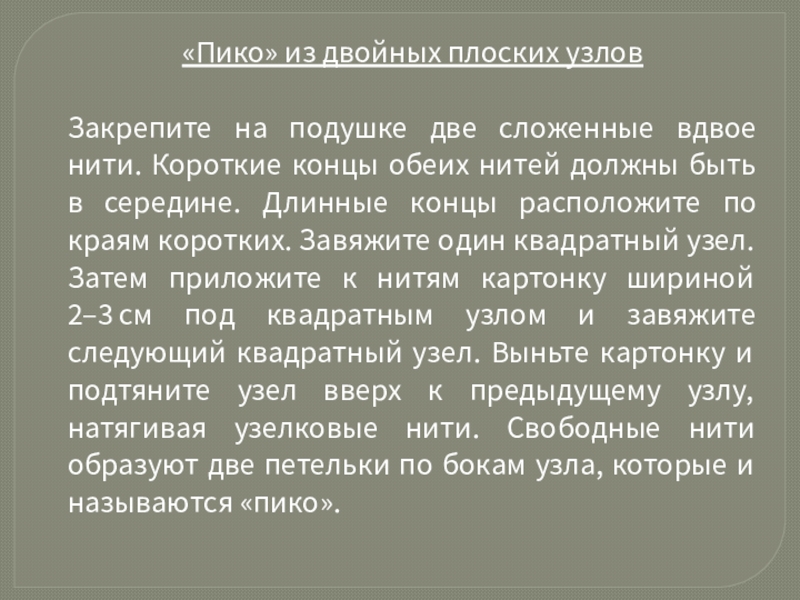 Короткие концы обеих нитей должны быть в середине. Длинные концы расположите по краям коротких. Завяжите один квадратный узел. Затем приложите к нитям картонку шириной 2–3 см под квадратным узлом и завяжите следующий квадратный узел. Выньте картонку и подтяните узел вверх к предыдущему узлу, натягивая узелковые нити. Свободные нити образуют две петельки по бокам узла, которые и называются «пико».