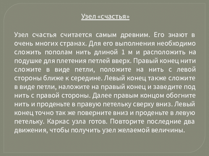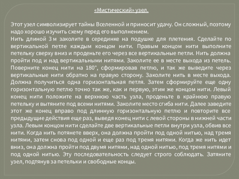 Этот узел символизирует тайны Вселенной и приносит удачу. Он сложный,