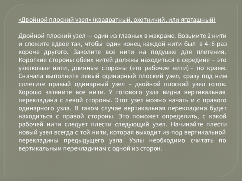 из главных в макраме. Возьмите 2 нити и сложите вдвое так, чтобы один конец каждой нити был в 4–6 раз короче другого. Заколите все нити на подушке для плетения. Короткие стороны обеих нитей должны находиться в середине – это узелковые нити, длинные стороны (это рабочие нити) – по краям. Сначала выполните левый одинарный плоский узел, сразу под ним сплетите правый одинарный узел – двойной плоский узел готов. Хорошо затяните все нити. У готового узла видна вертикальная перекладина с левой стороны. Этот узел можно начать и с правого одинарного узла. В таком случае вертикальная перекладина будет находиться с правой стороны. Это поможет определить, с какой рабочей нити следует плести следующий узел. Начинайте плести новый узел всегда с той нити, которая выходит из-под вертикальной перекладины предыдущего узла. Узлы необходимо считать по вертикальным перекладинам с одной из сторон.
