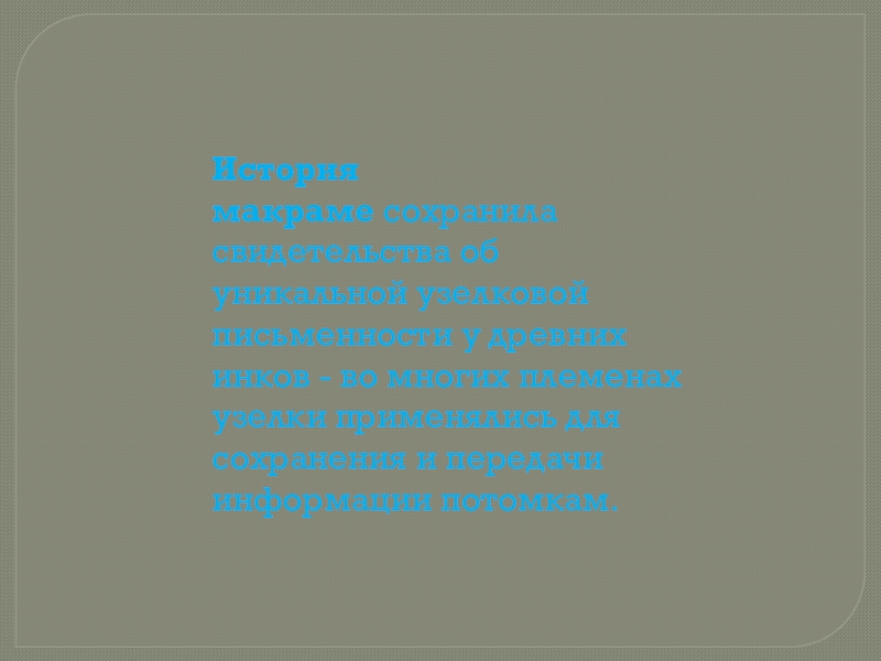 Слайд 4История макраме сохранила свидетельства об уникальной узелковой письменности у древних инков -
