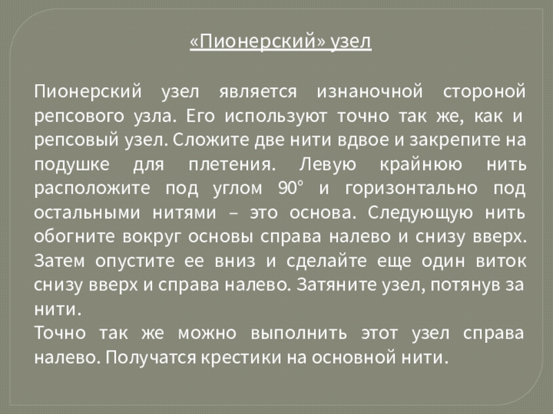 Пионерский узел является изнаночной стороной репсового узла. Его используют точно