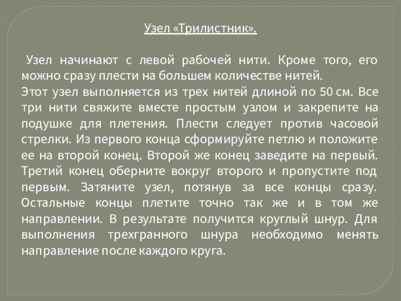 Этот узел выполняется из трех нитей длиной по 50 см. Все три нити свяжите вместе простым узлом и закрепите на подушке для плетения. Плести следует против часовой стрелки. Из первого конца сформируйте петлю и положите ее на второй конец. Второй же конец заведите на первый. Третий конец оберните вокруг второго и пропустите под первым. Затяните узел, потянув за все концы сразу. Остальные концы плетите точно так же и в том же направлении. В результате получится круглый шнур. Для выполнения трехгранного шнура необходимо менять направление после каждого круга.