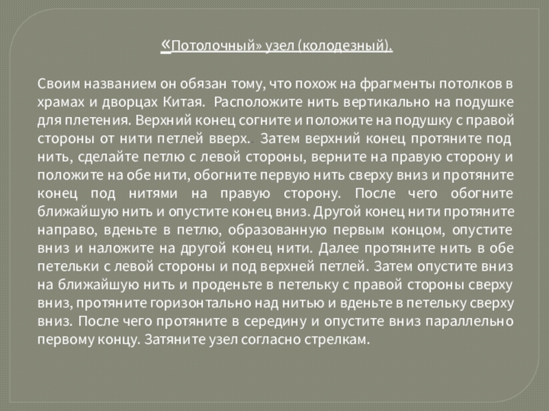 потолков в храмах и дворцах Китая. Расположите нить вертикально на подушке для плетения. Верхний конец согните и положите на подушку с правой стороны от нити петлей вверх.. Затем верхний конец протяните под нить, сделайте петлю с левой стороны, верните на правую сторону и положите на обе нити, обогните первую нить сверху вниз и протяните конец под нитями на правую сторону. После чего обогните ближайшую нить и опустите конец вниз. Другой конец нити протяните направо, вденьте в петлю, образованную первым концом, опустите вниз и наложите на другой конец нити. Далее протяните нить в обе петельки с левой стороны и под верхней петлей. Затем опустите вниз на ближайшую нить и проденьте в петельку с правой стороны сверху вниз, протяните горизонтально над нитью и вденьте в петельку сверху вниз. После чего протяните в середину и опустите вниз параллельно первому концу. Затяните узел согласно стрелкам.