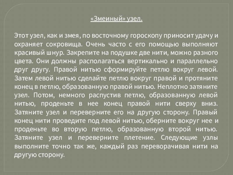 и охраняет сокровища. Очень часто с его помощью выполняют красивый шнур. Закрепите на подушке две нити, можно разного цвета. Они должны располагаться вертикально и параллельно друг другу. Правой нитью сформируйте петлю вокруг левой. Затем левой нитью сделайте петлю вокруг правой и протяните конец в петлю, образованную правой нитью. Неплотно затяните узел. Потом, немного распустив петлю, образованную левой нитью, проденьте в нее конец правой нити сверху вниз. Затяните узел и переверните его на другую сторону. Правый конец нити проведите под левой нитью, оберните вокруг нее и проденьте во вторую петлю, образованную второй нитью. Затяните узел и переверните плетение. Следующие узлы выполните точно так же, каждый раз переворачивая нити на другую сторону.