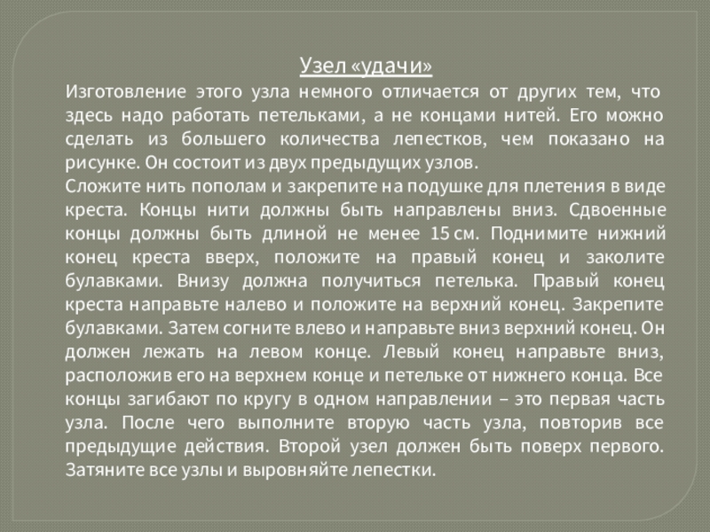 странах. Для его выполнения необходимо сложить пополам нить длиной 1 м и расположить на подушке для плетения петлей вверх. Правый конец нити сложите в виде петли, положите на нить с левой стороны ближе к середине. Левый конец также сложите в виде петли, наложите на правый конец и заведите под нить с правой стороны. Далее правым концом обогните нить и проденьте в правую петельку сверху вниз. Левый конец точно так же поверните вниз и проденьте в левую петельку. Каркас узла готов. Повторите последние два движения, чтобы получить узел желаемой величины.
