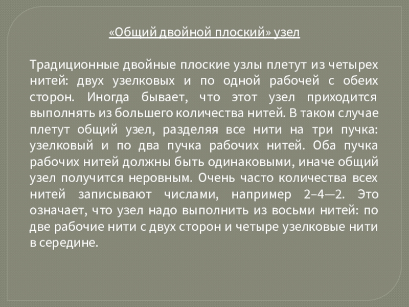 Традиционные двойные плоские узлы плетут из четырех нитей: